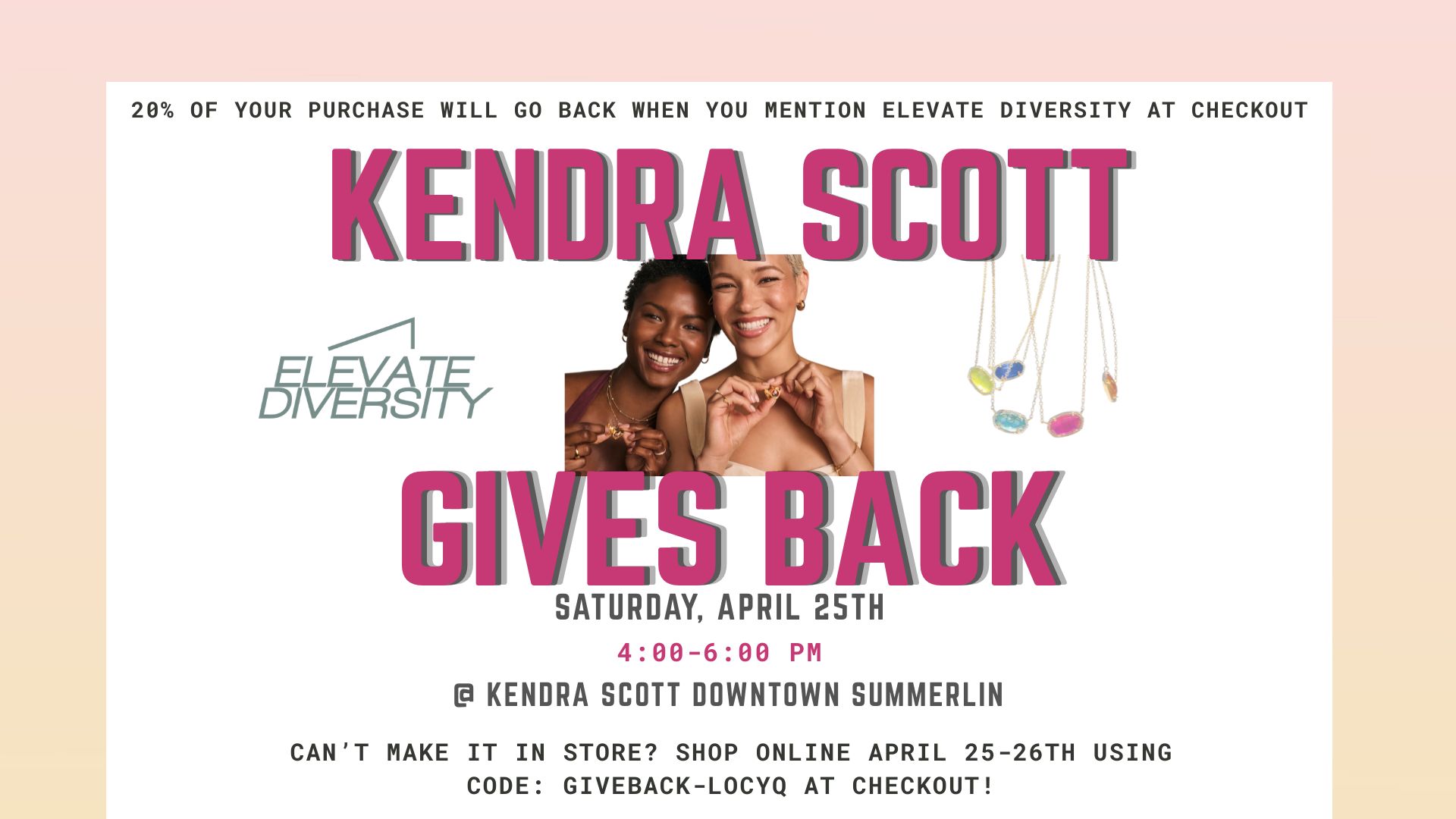 Shop online April 25–26 at kendrascott.com using code GIVEBACK-LOCYQ to still give back.