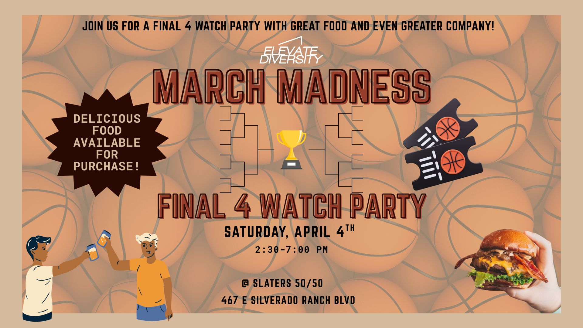 We’re kicking things off immediately — like, tonight immediately. If you’re reading this the day it drops, our first event is our Final Four watch party at Slater’s 50/50. Come hungry, grab a drink, and get ready to watch some ball with the crew 🏀