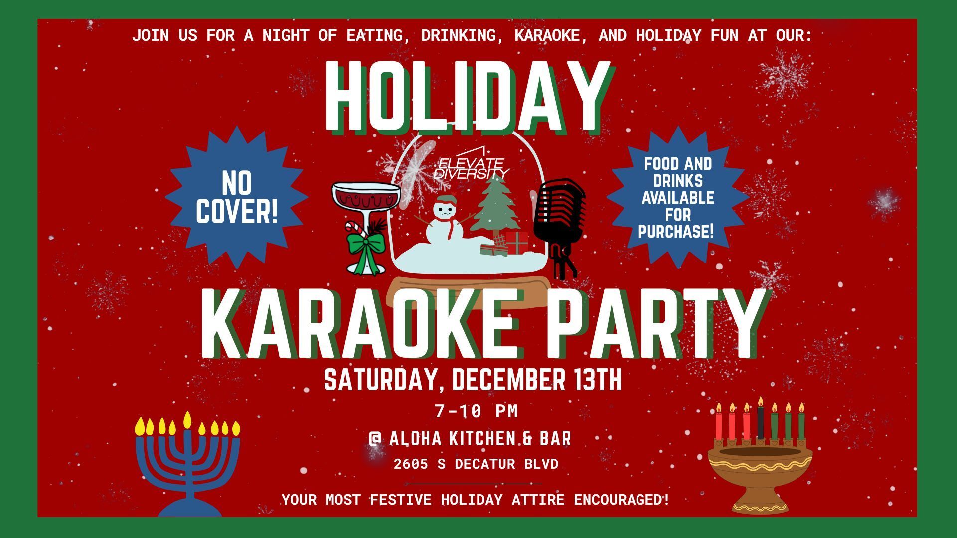Get ready for a night of singing, sipping, and serious holiday cheer! Join Elevate Diversity for our annual Holiday Karaoke Party, where the vibes are festive, the music is loud, and the memories are guaranteed.