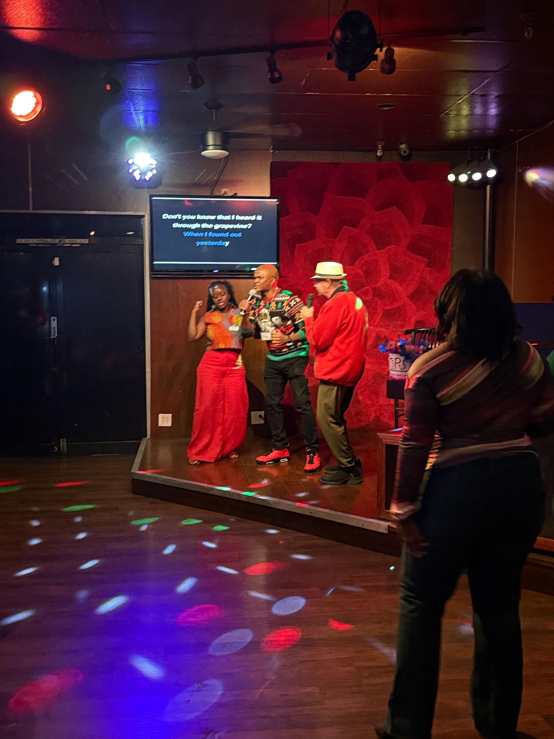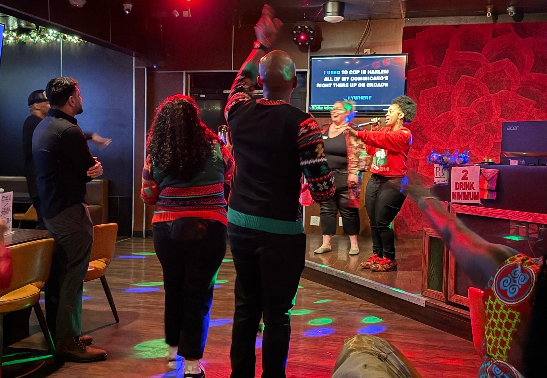 Check out these handsome guys helping the community! | Getting down on the microphone at our holiday karaoke party! |